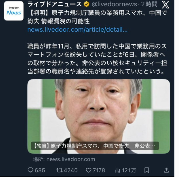 【独自】原子力規制庁スマホ、中国で紛失 非公表の職員名など漏えい可能性 - ライブドアニュース