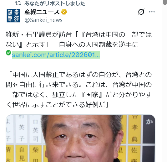 維新・石平議員が訪台「『台湾は中国の一部ではない』と示す」 自身への入国制裁を逆手に - 産経ニュース