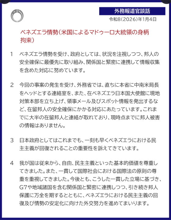 ベネズエラ情勢(米国によるマドゥーロ大統領の身柄拘束)(外務報道官談話)|外務省