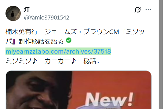 あのジェームス・ブラウンがカップ麺のCMに出演。どころか代表曲のセックスマシーンを本人が替え歌しているのであーる。